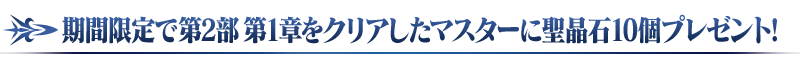 7月27日(金) AM3:59までの期間に、メインクエスト第2部 第1章「Lostbelt No.1 永久凍土帝国 アナスタシア 獣国の皇女」をクリアしたマスターの方全員に、聖晶石10個をプレゼント!