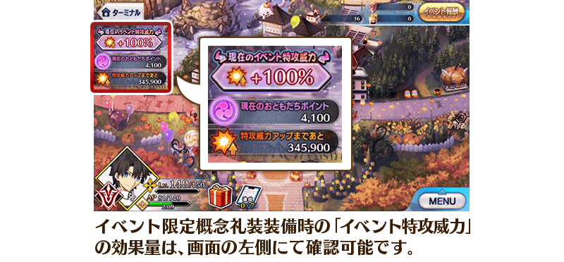 現在の「攻撃の威力がアップ」の効果と、次の威力アップまでの必要ポイントは、ストーリーを進めるとマップ画面とイベント報酬画面の左側に表示されるようになります。