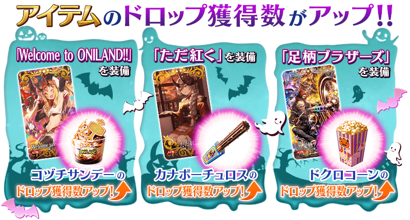 聖晶石召喚にてピックアップされる期間限定概念礼装「Welcome to ONILAND!!」「ただ紅く」「足柄ブラザーズ」を装備することで、本イベント専用アイテム「コヅチサンデー」「カナボーチュロス」「ドクロコーン」それぞれのドロップ獲得数がアップします。