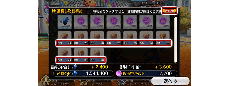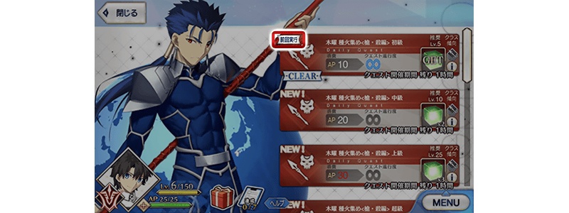 ※クエストクリア報酬、戦利品、マスターEXP、魔術礼装EXP、絆ポイントを獲得できるのは初回クリア時のみです。