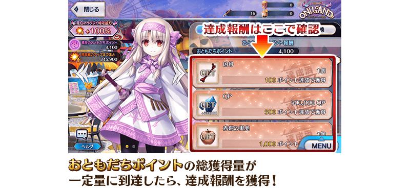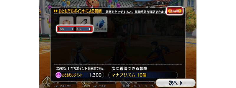 おともだちポイントの総獲得量が一定量に到達するごとに、達成報酬を獲得できます。