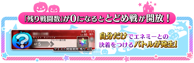 「残り戦闘数」が0回になったあとはとどめ戦というクエストが発生し、ストーリーを先に進めることができます。