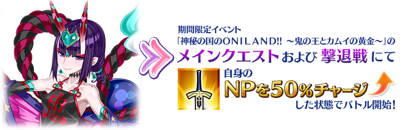 「★4(SR)酒呑童子(キャスター)」は、本イベントのメインクエストおよび撃退戦にて、自身のNPを50%チャージした状態でバトルを開始できます。