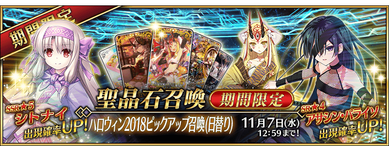 「★4(SR)アサシン・パライソ」「★4(SR)茨木童子(バーサーカー)」を日替りでピックアップ、「★5(SSR)シトナイ」を常時ピックアップいたします。