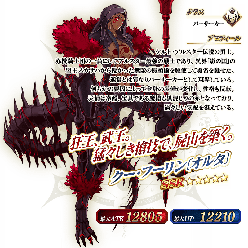 ※上記にて紹介しているサーヴァント「★5(SSR)クー・フーリン〔オルタ〕」のイラストは霊基再臨第2段階のものです。