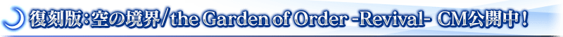 Fate/Grand Order公式サイト内トップページおよびギャラリーにて、コラボレーションイベントリバイバル「復刻版:空の境界/the Garden of Order -Revival-」のTVCMを公開しております。 あわせてご確認ください。