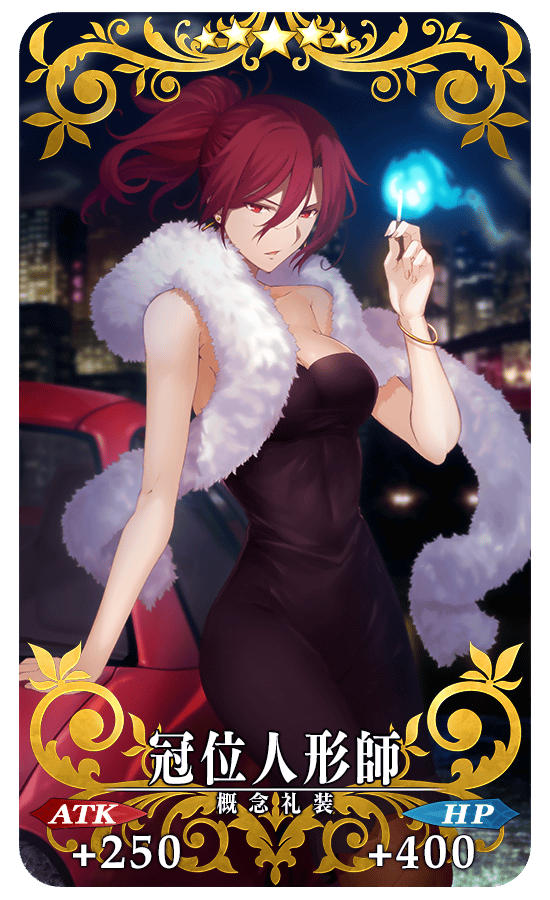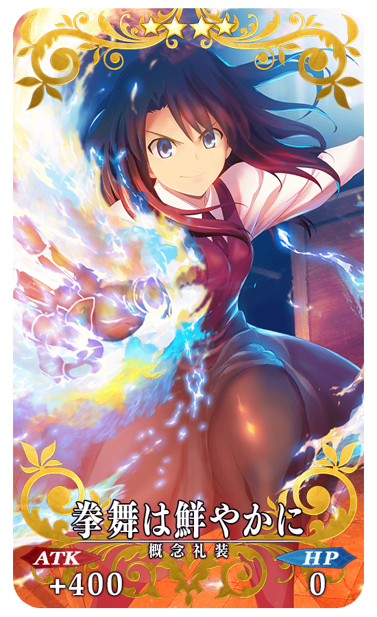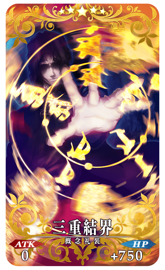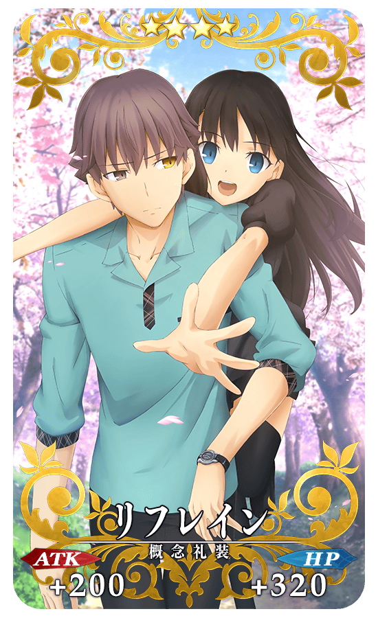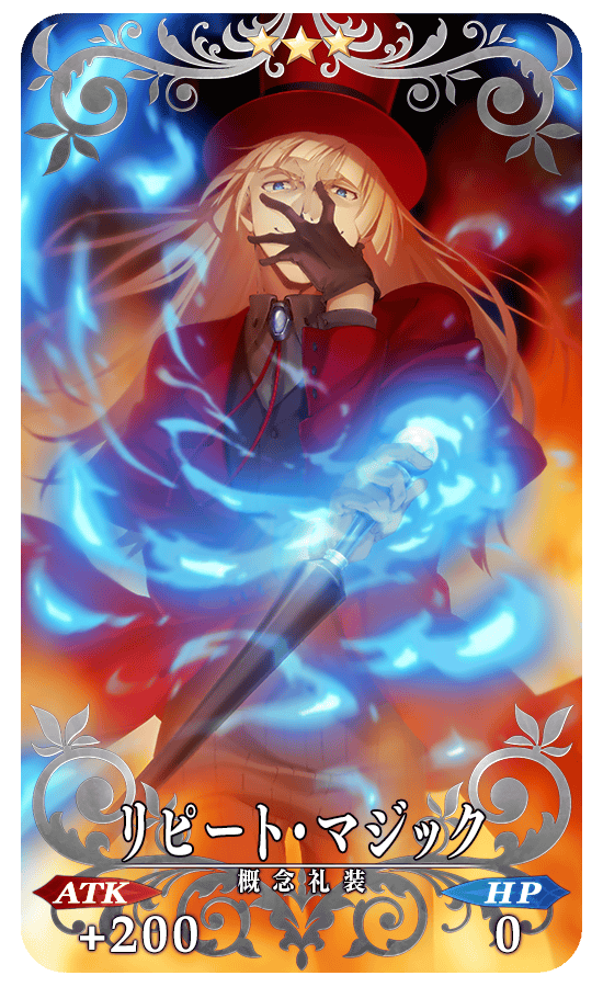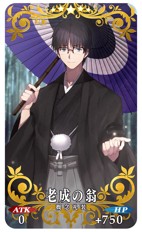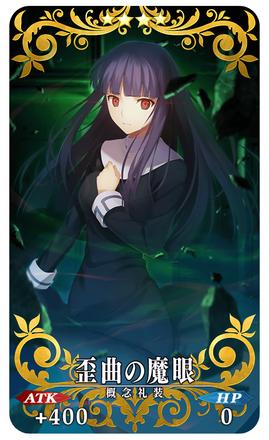 期間限定概念礼装「★5(SSR)老成の翁」「★5(SSR)冠位人形師」「★4(SR)歪曲の魔眼」「★4(SR)拳舞は鮮やかに」「★3(R)スプリンター」「★3(R)リピート・マジック」は装備することで、コラボレーションイベントリバイバル「復刻版:空の境界/the Garden of Order -Revival-」におけるイベント専用アイテムのドロップ獲得数がアップいたします。