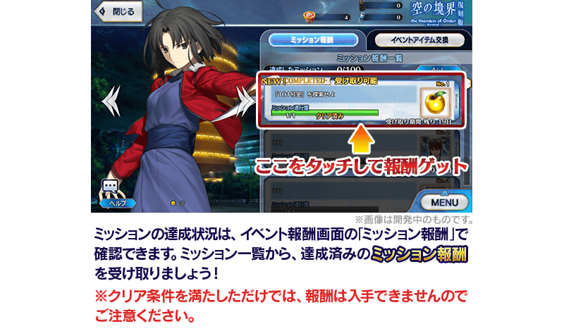 「復刻版:空の境界/the Garden of Order -Revival-」では、「特定のアイテムを一定数以上集める」「特定のエネミーを倒す」など、さまざまな条件を達成することで、豪華報酬を獲得できるミッションが発生します!