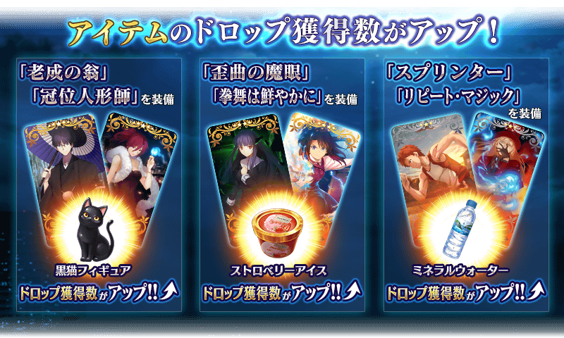 聖晶石召喚でピックアップ中の期間限定概念礼装「老成の翁」「冠位人形師」「歪曲の魔眼」「拳舞は鮮やかに」「スプリンター」「リピート・マジック」を装備することで、コラボレーションイベントリバイバル「復刻版:空の境界/the Garden of Order -Revival-」におけるイベント専用アイテム「黒猫フィギュア」「ストロベリーアイス」「ミネラルウォーター」のドロップ獲得数がアップします。