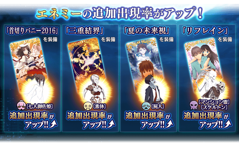 イベントアイテム交換にて入手できるイベント限定概念礼装「首切りバニー2016」「三重結界」「夏の未来視」「リフレイン」を装備することで、ミッションクリア条件の対象となるエネミーの追加出現率がアップします。