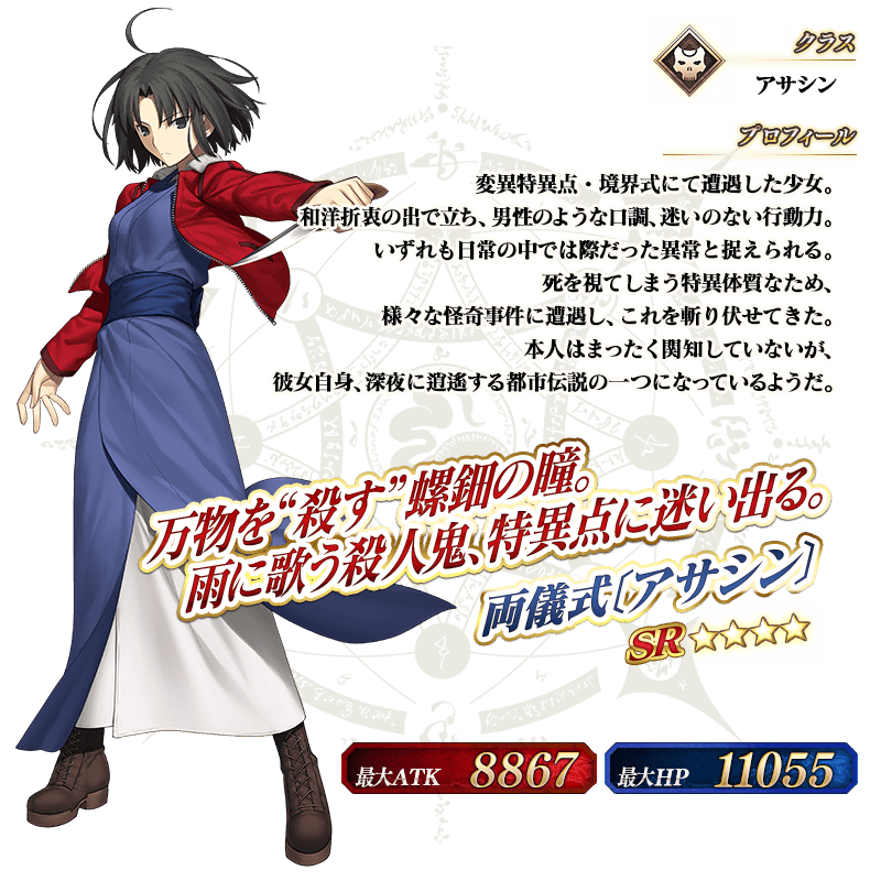 奈須きのこ原作「空の境界 the Garden of sinners」より、ヒロイン「両儀式」がイベント限定サーヴァント「★4(SR)両儀式〔アサシン〕」として「Fate/Grand Order」の世界に登場!