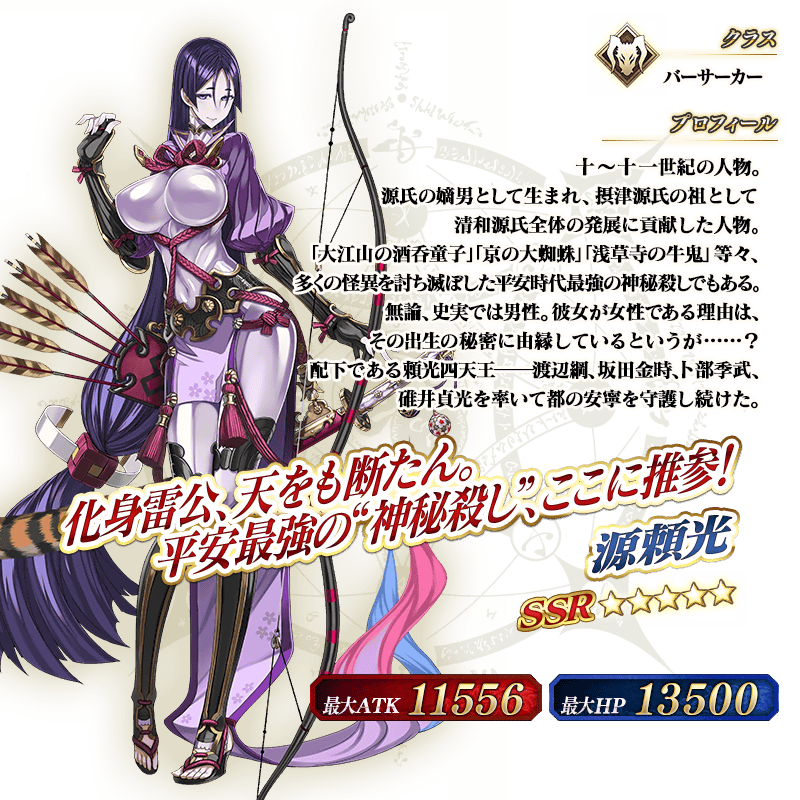 ※上記の「★5(SSR)源頼光(バーサーカー)」のセイントグラフは霊基再臨第2段階の画像となります。