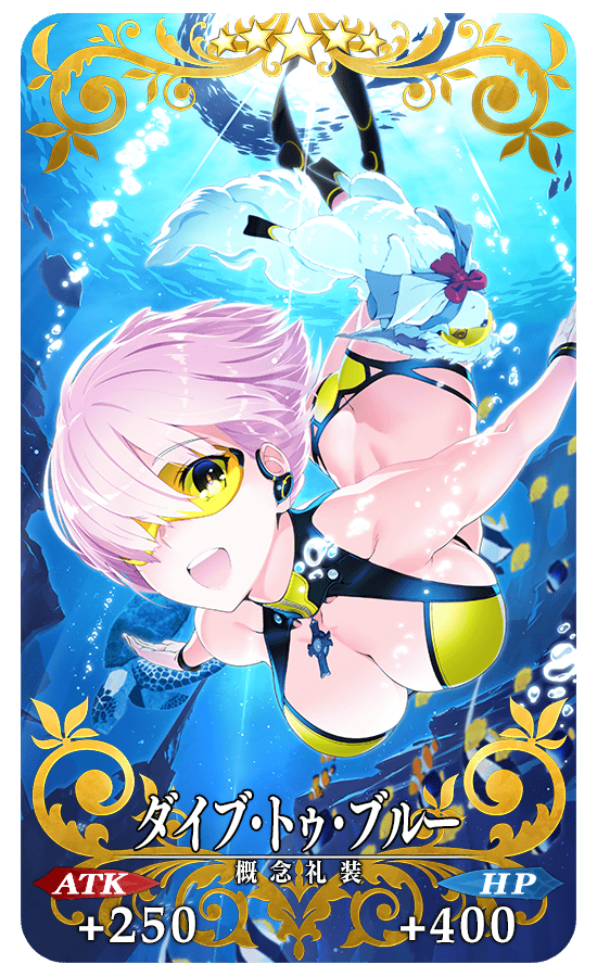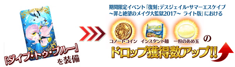 イベントアイテム交換で入手できるイベント限定概念礼装「★5(SSR)ダイブ・トゥ・ブルー」を装備すると、期間限定イベント「復刻:デスジェイル・サマーエスケイプ ~罪と絶望のメイヴ大監獄2017~ ライト版」におけるイベント専用アイテム「コノートコイン」「インスタント麺」「一粒のあめ玉」のドロップ獲得数がアップします。