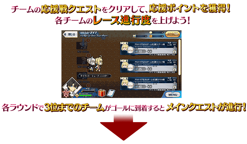 任意で応援したいチームの応援戦クエストをクリアすると、応援ポイントを獲得し、そのチームのレースの進行度が上昇します。