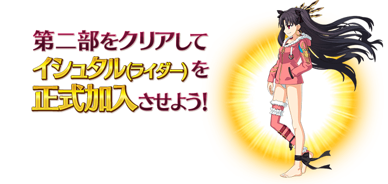 第一部のメインクエスト進行時に期間限定加入した「★4(SR)イシュタル(ライダー)」は、第ニ部のメインクエストをクリアすることで正式加入いたします。