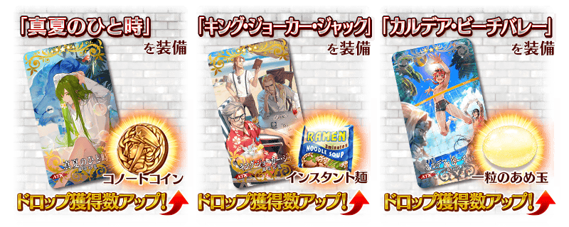 聖晶石召喚にてピックアップ中の期間限定概念礼装「真夏のひと時」「キング・ジョーカー・ジャック」「カルデア・ビーチバレー」を装備することで、期間限定イベント「復刻:デスジェイル・サマーエスケイプ ~罪と絶望のメイヴ大監獄2017~ ライト版」におけるイベント専用アイテム「コノートコイン」「インスタント麺」「一粒のあめ玉」それぞれのドロップ獲得数がアップします。