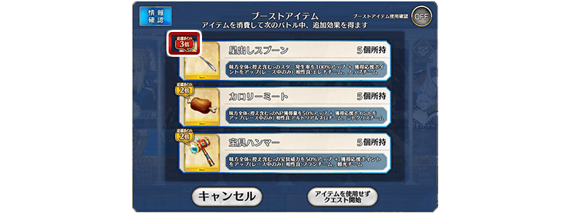 各チームの応援戦クエストを選択後、クエスト開始ボタンをタッチすると表示されるブーストアイテム選択画面では、それぞれのブーストアイテムごとに応援ポイントのボーナス倍数が表示されます。