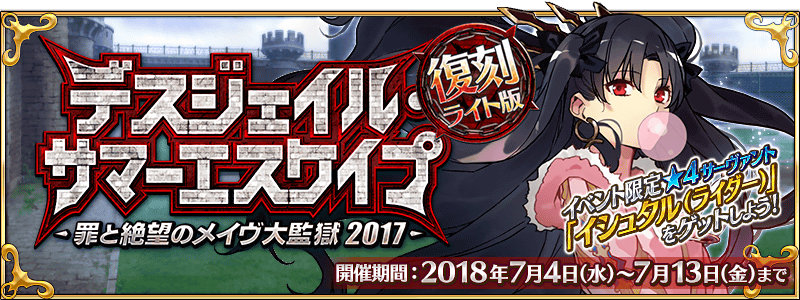 2017年に開催した「デスジェイル・サマーエスケイプ ~罪と絶望のメイヴ大監獄2017~ ピックアップ2召喚」の内容を一部変更し復刻いたします。