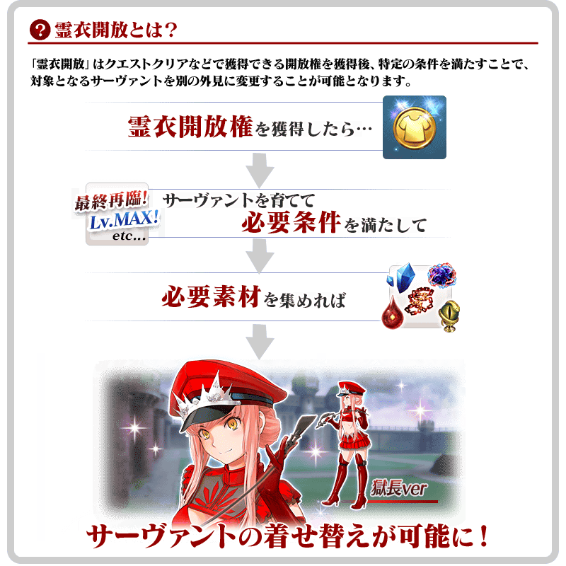 ※「霊衣開放」による変更はサーヴァントの外見やボイスのみでクラスやパラメータなどに変化はありません。