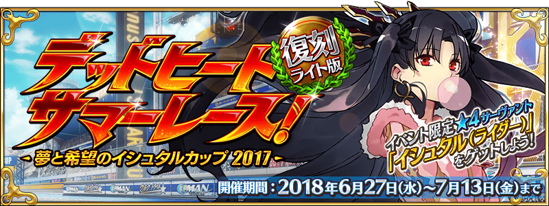 「復刻:デッドヒート・サマーレース! ~夢と希望のイシュタルカップ2017~ ライト版」および「復刻:デスジェイル・サマーエスケイプ ~罪と絶望のメイヴ大監獄2017~ ライト版」の詳細については、下記バナーよりご確認ください。