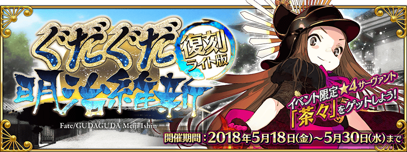 イベント限定サーヴァント「★4(SR)茶々」を入手できる期間限定イベント「復刻:ぐだぐだ明治維新 ライト版」の詳細については、下記のバナーよりご確認ください。