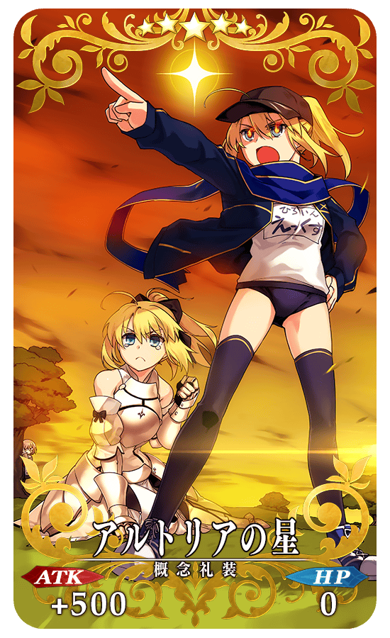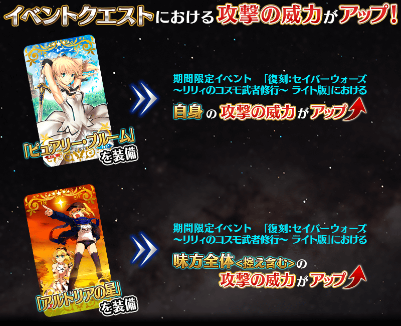 イベントアイテム交換やイベントポイント報酬にて入手できるイベント限定概念礼装「ピュアリー・ブルーム」「アルトリアの星」を装備することで、期間限定イベント「復刻:セイバーウォーズ ~リリィのコスモ武者修行~ ライト版」のイベントクエストにおける攻撃の威力がアップします。