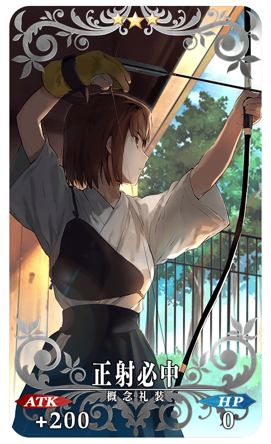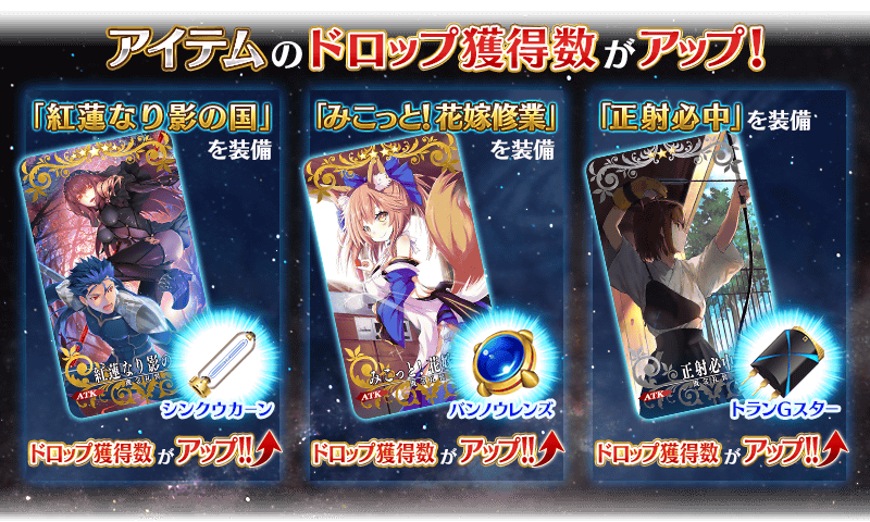 期間限定概念礼装「★5(SSR)紅蓮なり影の国」「★4(SR)みこっと!花嫁修業」「★3(R)正射必中」は装備することで、期間限定イベント「復刻:セイバーウォーズ ~リリィのコスモ武者修行~ ライト版」におけるイベント専用アイテムのドロップ獲得数がアップいたします。