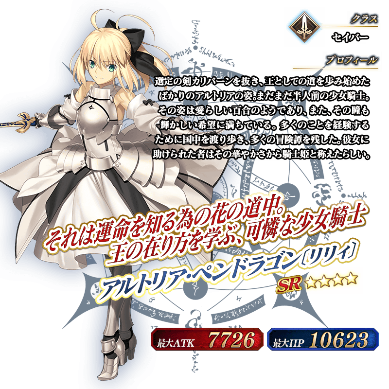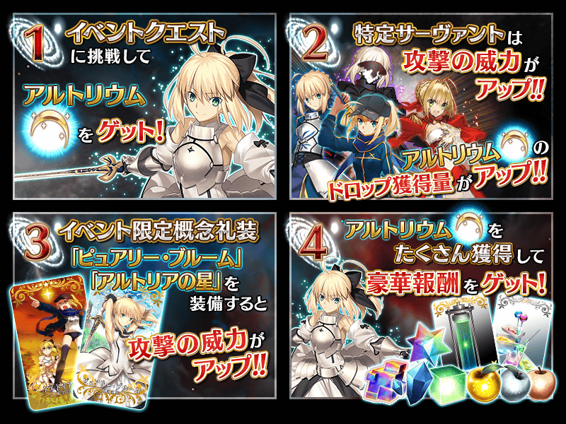 イベントクエストに挑戦して不思議な物質「アルトリウム」を集め、「★4(SR)アルトリア・ペンドラゴン〔リリィ〕」をゲットしましょう!