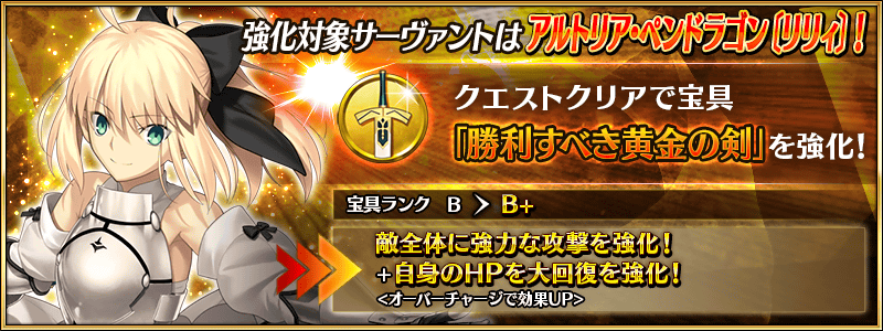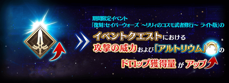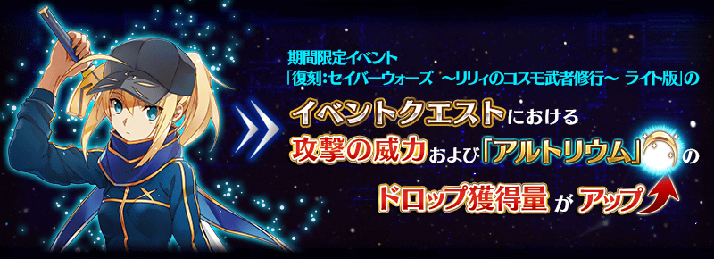 セイバークラスの全サーヴァントは、期間限定イベント「復刻:セイバーウォーズ ~リリィのコスモ武者修行~ ライト版」のイベントクエストにおける攻撃の威力およびイベントアイテム「アルトリウム」のドロップ獲得量がアップします。