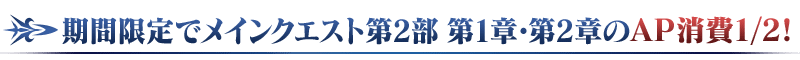 現在、永続的に開催しているAP消費量1/2の状態に、さらにAP消費量1/2を追加して、期間限定でメインクエスト第1部(特異点Fから終局特異点まで)のAP消費量が1/4になります!