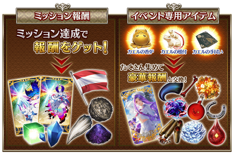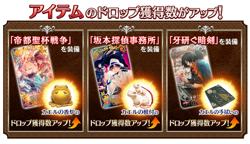 聖晶石召喚にてピックアップされる期間限定概念礼装「帝都聖杯戦争」「坂本探偵事務所」「牙研ぐ暗剣」を装備することで、期間限定イベント「ぐだぐだ帝都聖杯奇譚」におけるイベント専用アイテム「カエルの香炉」「カエルの根付」「カエルの手拭い」のドロップ獲得数がアップします。