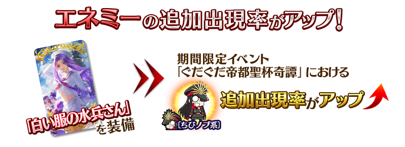 イベントアイテム交換で入手できるイベント限定の概念礼装「白い服の水兵さん」を装備することで、ミッションクリア条件の対象となるエネミーの追加出現率がアップします。
