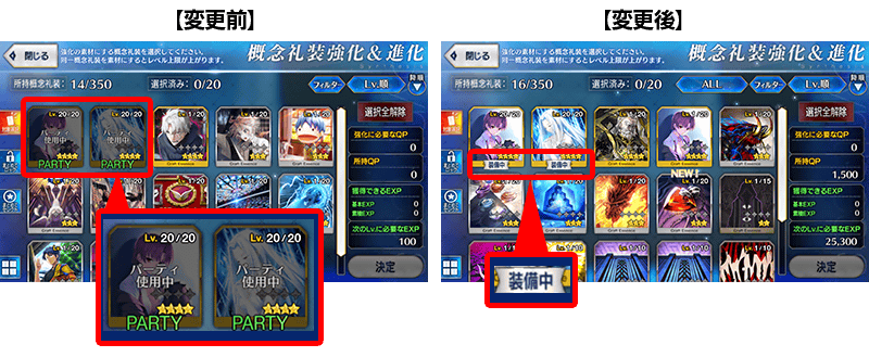 これまで装備中の概念礼装は暗転した状態で「パーティ使用中」と表示され、装備している概念礼装をはずさない限り選択できない仕様となっておりましたが、以降は「装備中」のアイコンが表示された状態となり、装備したままでも強化素材や霊基変還(売却)の対象として選択が可能となります。