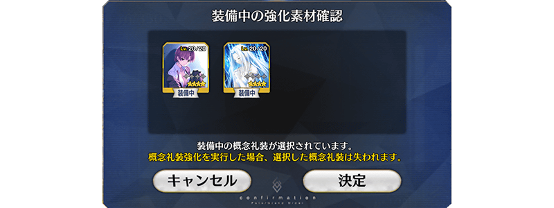 上記の変更にともない、「概念礼装強化&進化」画面および「霊基変還(売却)」画面で装備中の概念礼装が強化素材または霊基変還(売却)の対象として選択されている場合は、決定ボタンをタッチした際に確認のダイアログメッセージが表示されるようになります。