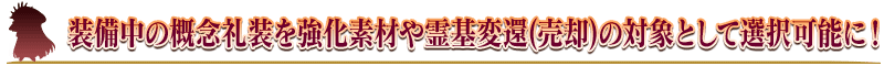 「概念礼装強化&進化」画面および「霊基変還(売却)」画面にて、パーティ、もしくはサポートに設定しているサーヴァントが装備している概念礼装が強化素材や、霊基変還(売却)の対象として選択可能となります。