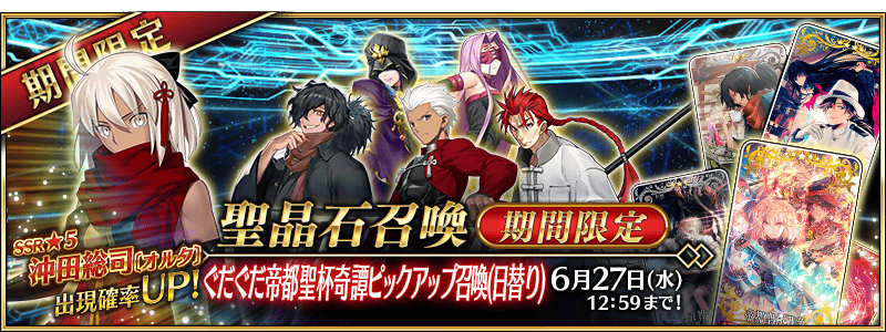 「★4(SR)エミヤ(アーチャー)」「★4(SR)李書文」「★3(R)メドゥーサ(ライダー)」「★3(R)メディア」を日替りでピックアップ、「★5(SSR)沖田総司〔オルタ〕」「★3(R)岡田以蔵」を常時ピックアップいたします。