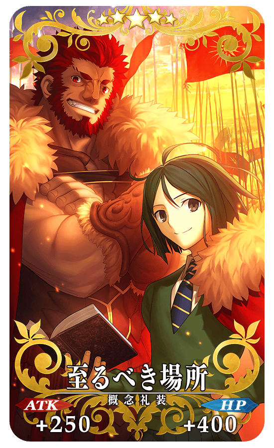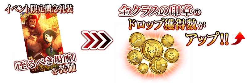 イベントアイテム交換にて入手できるイベント限定の概念礼装「至るべき場所」を装備することで、「復刻版:Fate/Accel Zero Order -LAP_2-」における全クラスの印章のドロップ獲得数がアップします。