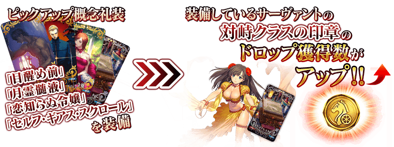 聖晶石召喚にてピックアップされる概念礼装「目醒め前」「月霊髄液」「恋知らぬ令嬢」「セルフ・ギアス・スクロール」を装備することで、「復刻版:Fate/Accel Zero Order -LAP_2-」における、一部のクラスの印章のドロップ獲得数がアップします。