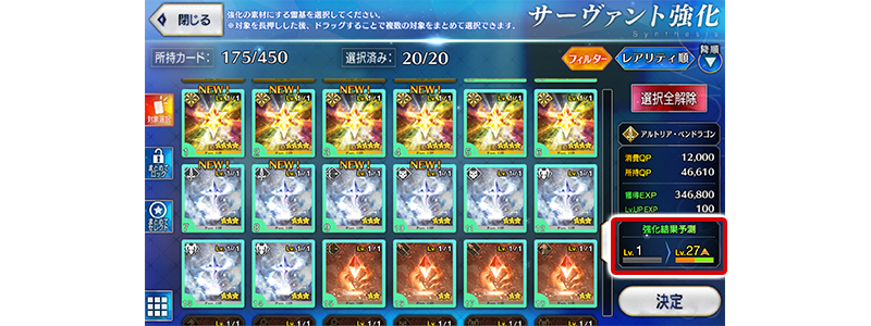 サーヴァント強化画面での素材選択時に、選択中の素材で強化した場合の「強化による到達レベル」の予測が表示されるようになります。