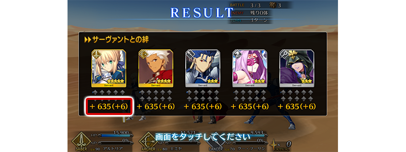 リザルト画面で表示される獲得絆ポイントを、「クエストで獲得できる絆ポイント」と「一部クラススキルや概念礼装などの効果で増加した絆ポイント」に分けて表示されるようになります。増加した絆ポイントは()内に表示されます。