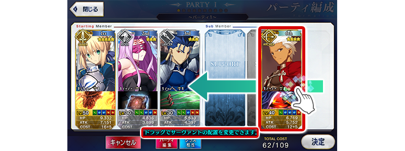「MENU」>「編成」のパーティ編成画面、ならびにクエスト開始前などのパーティ確認画面において、サーヴァントや概念礼装を選択・入れ替えた場合、「決定」を選択するまではパーティ編成途中の状態となりますが、この状態でもサーヴァントをドラッグすることで配置変更をすることができるようになります。