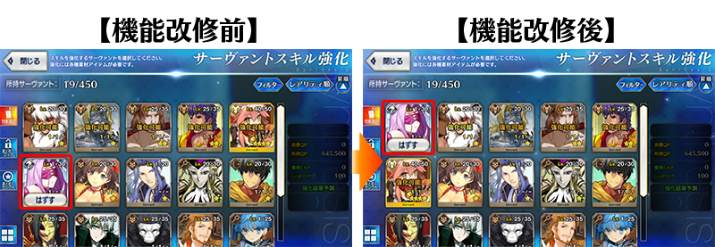 これにより、選択中のサーヴァントや概念礼装を見つけやすく、また、「はずす」が選択しやすくなります。