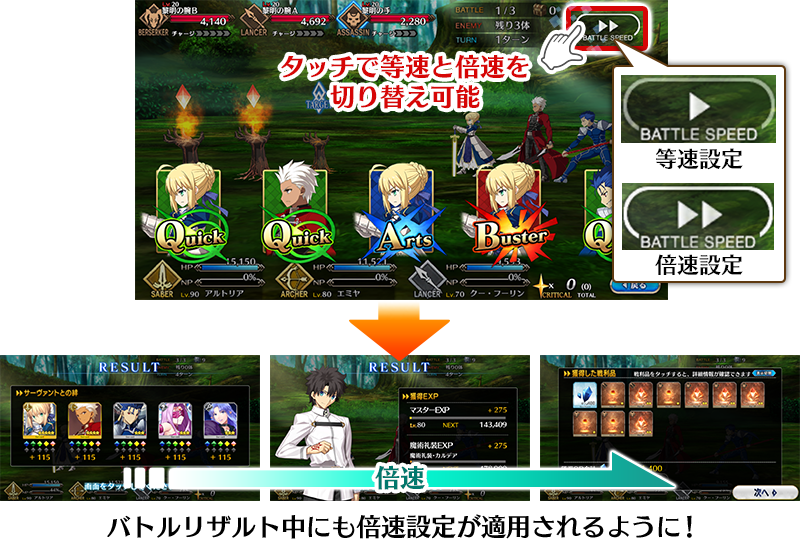 バトルリザルト(バトル終了後のBATTLE FINISH表示、サーヴァントとの絆、獲得EXP、獲得した戦利品の各画面)についても倍速設定が適用されるようにいたします。