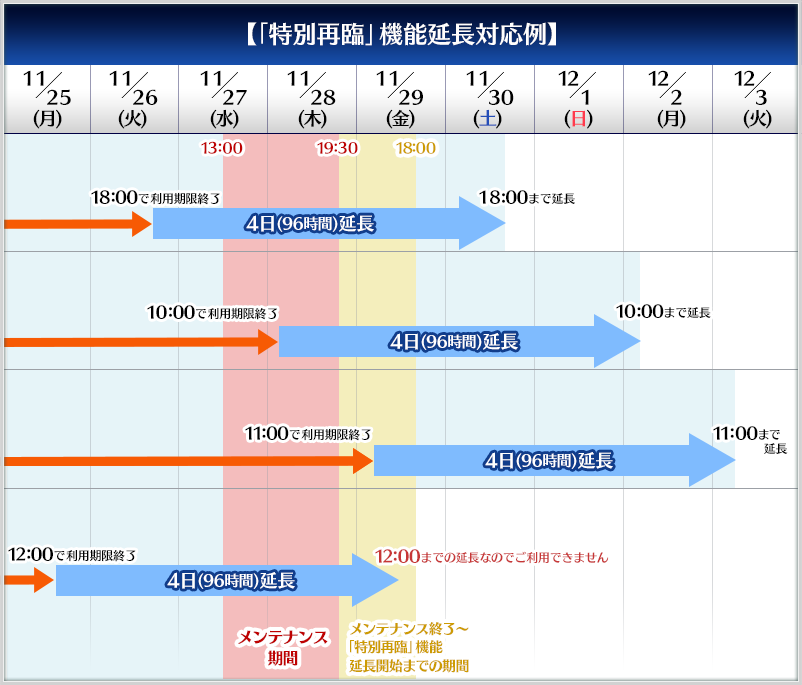 2019年11月27日(水) 13:00~11月28日(木) 19:30までの期間に実施された長時間メンテナンスの影響を考慮し、「特別再臨」機能の利用期限を4日(96時間)延長する対応をおこないます。
