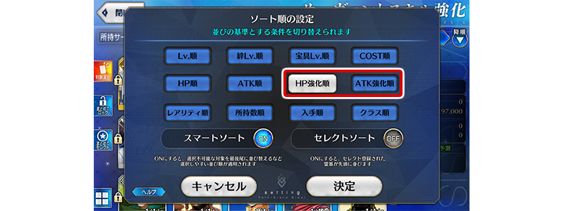 ②HP強化順・ATK強化順でのソートを他の画面にも拡張 サーヴァントを選択する際の、HP強化順・ATK強化順でのソートを、パーティ編成やサーヴァントスキル強化などの画面にも拡張いたします。