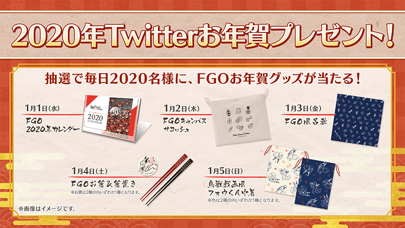 Fate/Grand Order公式Twitter(@fgoproject)をフォロー&リツイートで、非売品の日替わり「FGOお年賀グッズ」を抽選で毎日2,020名、合計10,100名様にプレゼント!