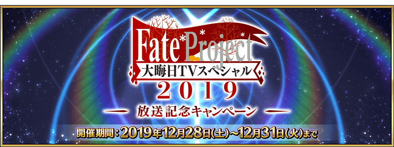 「Fate Project 大晦日 TVスペシャル 2019」の放送を記念して、『「Fate Project 大晦日 TVスペシャル 2019」放送記念キャンペーン』を開催することを発表いたしました。