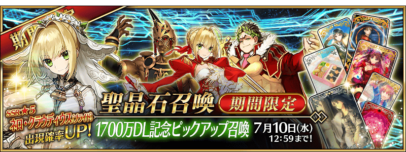 ※「★4(SR)ネロ・クラウディウス(セイバー)」「★3(R)ガイウス・ユリウス・カエサル」「★3(R)ロムルス」はピックアップ期間終了後もストーリー召喚にて排出されます。