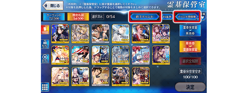 「終了イベント」フィルターを使って、イベント終了後に概念礼装を霊基保管室への移動する場合などにお役立てください。