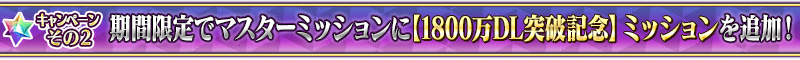 下記の期間中、「マスターミッション」の「限定」タブ内に期間限定で「【1800万DL突破記念】ミッション」が追加されます。